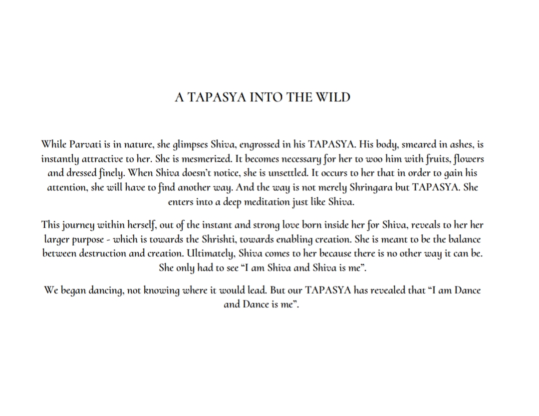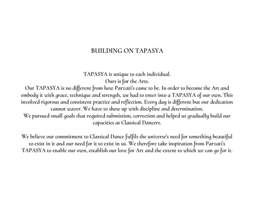 In an effort to illustrate the making of a Classical Dancer, we are scripting a production titled "TAPASYA". Our research and understanding, once penned down, will be translated into choreography and coordinated Classical movement. This project is the brainchild of our Girls in Grey on THE JUNOON GURUKUL at The Avasara Academy, India.